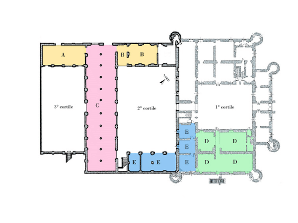Il complesso si articola su tre corti interne poste in successione, edificate in momenti diversi.